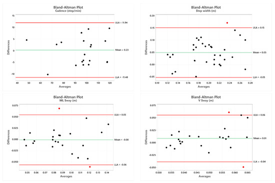 Similar considerations could be made for the V sway parameter. Although there were no particular concerns about this index, it is evident that the obtained results, in terms of ICC and correlation values, were lower than those of the other parameters. These differences could be related to the different 3D COM positions estimated by the two systems, which could have slightly interfered with the reliability of the results; or, more likely, to the lesser relevance of vertical swaying during walking, which involves less marked up–down body movements.