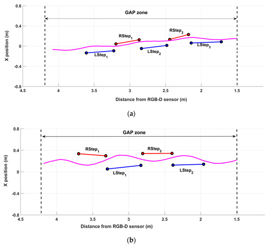 Gait patterns of one PD (a) and one post-stroke (b) participant. The black dotted lines delimit the GAP zone. The x-axis represents the 3D distance of the subject from the RGB-D sensor, while the y-axis represents the position relative to the sensor’s x-axis. The magenta lines represent the trajectory of COMHIP.