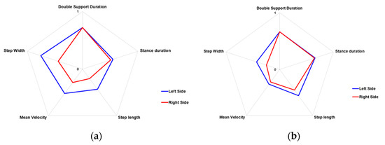Radar charts of the relevant gait parameters for the left and right sides of the PD (a) and PS (b) performance.