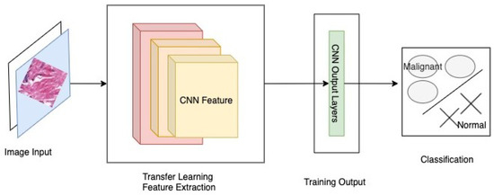 In the work by Ayana et al. [23], they focused on transfer learning methods applied on ultrasound breast image classification and detection using pre-trained CNN models. Moreover, their review on some of the most commonly used transfer learning techniques presents the potential of future research in this field. Khamparia et al. [24] in their work proposed a hybrid transfer learning model, mainly a fusion of MVGG and ImageNet, and achieved an accuracy of 94.3%. They implemented their model on the WSI dataset. They also employed image segmentation and 3D mammography in their work, which helped to acquire better results.