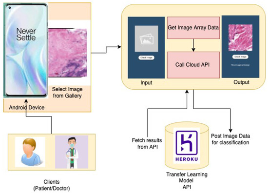 Following the proposed approach, a cloud integrated mobile application has been developed based on the Android operating system for the detection and classification of Breast Cancer Histopathological Images.The App Architecture Design is shown in Figure 5 The app allows users to browse and upload an image and feed it to the application. The application in turn will evaluate the image, using the model proposed and provide a classified label probability. The proposed application can be used by patients having biopsy or histopathological images obtained from clinics. In addition, doctors can utilize this application for easy diagnoses of breast cancer and also to save their time for fast and efficient diagnoses.