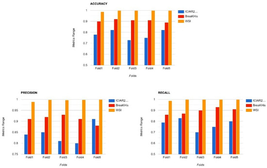 Before the model is trained, there is a requirement of cleaning the dataset and converting it to the proper form to be fed into deep neural networks for classification. Image processing is a necessary step to achieve significant and accurate classification. The database includes images of various sizes ranging from 512 × 512 pixels to 1024 × 1024 pixels. Therefore, before passing the images for feature extraction, they have been resized to a size of 224 × 224 × 3 pixels to be ready as input to the system. The preprocessing needed for applying transfer learning on breast cancer histopathological images also involves reducing class imbalance. Moreover, the models were also trained on original sized images without any cropping or resizing to ensure there is no loss in quality or features from the image. A comparison chart of the accuracy across 5 folds of BreakHis Dataset is visualized in Figure 3.