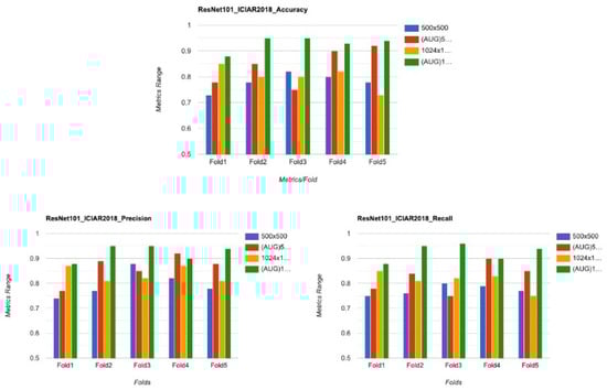 Comparison of the performance metrics ICIAR2018 for different resolutions.