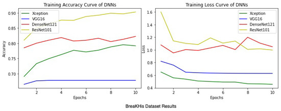 Average training accuracy and aoss of 5 folds for the BreaKHis dataset.