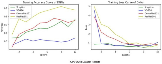Average training accuracy and loss of 5 folds for the ICIAR2018 dataset.