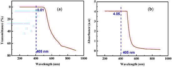 (a) Red solid line: transmission spectrum and (b) red solid line: absorption spectrum of pristine polyimide (blue dotted line in each curve shows the guidance to the transmission and absorption at 405 nm).
