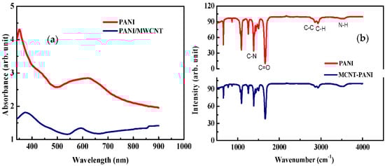 (a) UV−Visible of PANI and PANI/MWCNT in DMF and (b) Infrared spectroscopy of PANI and MWCNT−PANI in DMF.