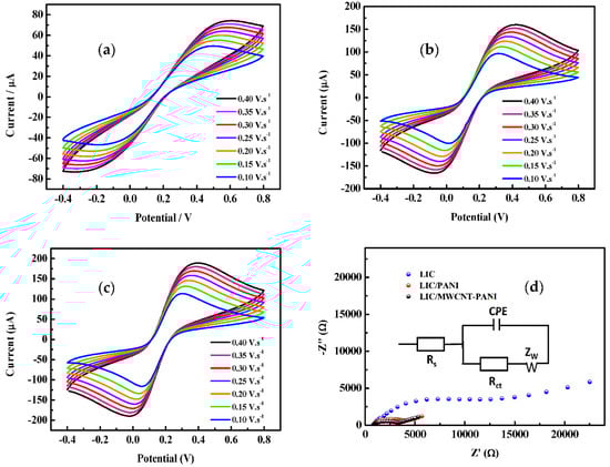 CVs of the prepared transducers, (a) LIC, (b) LIC/PANI and (c) LIC/MWCNT-PANI recorded at different scan rates from 100 to 400 mV·s−1 in the presence of the redox mediators 5 mM [Fe(CN)6]3−/4− in 0.1 M KCl and (d) Nyquist plots of the bare LIC, LIC/PANI and LIC/MWCNT-PANI electrodes; inset: equivalent circuit.