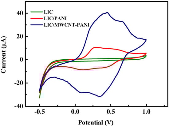 In order to investigate the electro-catalytic activity of the PANI and MWCNT-PANI films at the electrode surface, CV measurements were carried in 0.1 M HCl (pH = 1) from −0.5 to 1 V at a scan rate of 50 mV·s−1 (Figure 6). The typical CV response of polyaniline has been well reported in previous works [] showing two sets of oxido-reduction peaks. The first set of redox peaks is linked to the conversion of the reduced leucoemeraldine base to the partially oxidized emeraldine. The second is related to the conversion of emeraldine to the fully oxidized pernigraniline. At the bare LIC, no significant electrocatalytic current response has been observed. The difference in electrochemical behavior between the pure PANI and MWCNT-PANI nanocomposite films is clear from the CVs.