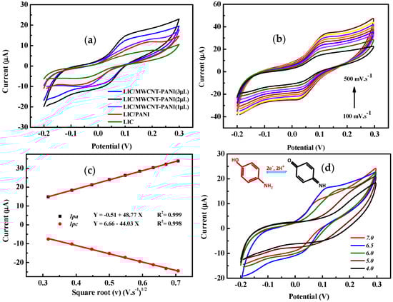 (a) CVs obtained by bare LIC, LIC/PANI and LIC/MWCNT-PANI in the presence of 1.0 mM 4-AP in 0.1 M PBS (pH = 6.5) Scan rate of 100 mV·s−1, (b) LIC/MWCNT-PANI in the presence of 1.0 mM 4-AP in 0.1 M PBS (pH = 6.5) at different scan rates from 100 mV·s−1 to 500 mV·s−1; (c) Linear fitting of the peak current with the square root of scan rate. Inset oxidation current against the scan rate (100 to 500 mV·s−1); (d) CVs LIC/MWCNT-PANI response of 1 mM 4-AP in 0.1 M PBS in different at 100 mV·s−1 scan rate and the inset: Redox reaction mechanism of 4-AP.