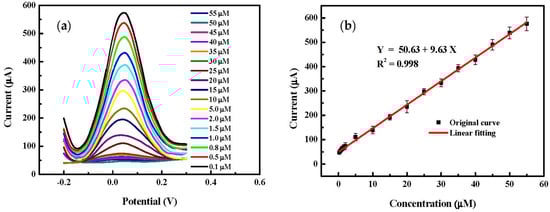 The SWV technique is increasingly used in the field of chemical sensors because of its high sensitivity due to the ability to discriminate the capacitive current [,,]. It has been used here to detect 4-AP with the proposed electrode (LIC/MWCNT-PANI). The effects of frequency from 1.0 to 20 Hz at fixed pulse amplitude (0.1 V) and potential step (0.01 V), on the LIC/MWCNT-PANI sensor response to 1.0 μM 4-AP in PBS (pH = 6.5) solution were studied (Figure S4). The highest and the stable analytical signal was obtained at 5 Hz, thus this frequency was selected for the sensor calibration. While the detection was performed in the possible range from −0.2 to 0.3 V and the pH test medium was adjusted to 6.5, the SWV responses were recorded with different concentrations of 4-AP from 0.1 μM to 55 μM (Figure 8a). It can be seen from the calibration curve in (Figure 8b) that a quite linear variation of the current can be observed with the increase of the concentration in the selected range Ipa (μA) = 50.63 + 9.63 × [4-AP], with a detection limit of 0.006 μM. The limit of detection has been determined based on Equation (3).