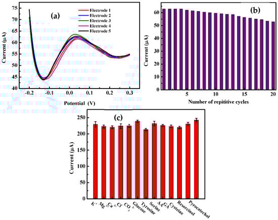 The influence of some inorganic ions, organic compounds and other phenolic compounds on the determination of 4-AP was studied and the results are presented in Figure 9c. The results show that 100-fold of K+, Mg2+, Ca2+, Cl−, CO32−, glucose, tyrosine, serine and ascorbic acid (AA), gallic acid (GA), cysteine, resorcinol and pyrocatechol do not interfere with the oxidation signal of 20 μM 4-AP.