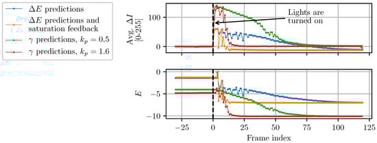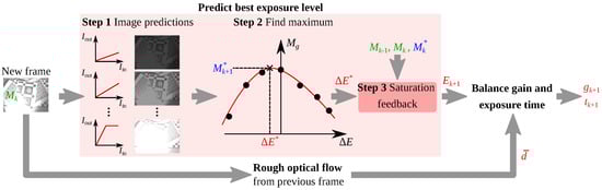 Almost every algorithm summarized in Table 1 employs a different control policy. Yet, the merits of each (apart from allowing some predictive control or leveraging some learning method) cannot realistically be compared in isolation from the choice of optimization metric, prediction model, and gain/exposure balance strategy. Among these, Shim’s AE algorithm [,] stands apart by its use of an explicit prediction model which enables the quick convergence of the camera exposure parameters with a simple feedback law. It is also the method closest to the one proposed in this work.