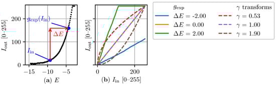 This approach does not require any camera characterization, but there exists no direct link between transformations and changes in camera exposure other than simulates a more exposed image while simulates a less exposed one. To avoid this limitation, Zhang [] proposed to leverage the photometric response function (PRF) of the camera as a way to make better predictions. This function maps the exposure E of the camera sensor to the intensity of the image: