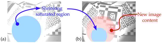 The performance of the proposed AE algorithm was tested and directly compared to using fixed exposure parameters, the camera’s built-in AE algorithm, and Mehta’s open-source implementation of Shim’s algorithm []. A supplementary video illustrating this comparison is available online (https://youtu.be/Guvhvb-uQpE accessed on 30 November 2021). The fixed exposure parameters were hand-tuned such that tracking would not be lost due to under- or over-saturation. The reference pixel intensity value tracked by the built-in AE algorithm was set to 20% of the maximum pixel intensity value. Using higher target values would result in some frames being overexposed, and tracking would be lost. To allow a fair comparison, Mehta’s original code was altered to use the gain/exposure balance strategy of this work. Settings for the nonlinear controller were also selected to obtain a convergence time similar to the method proposed in this work (i.e., and , as demonstrated in Section 3.2).