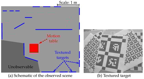 A top-view schematic of the static scene observed throughout the experiments is shown in Figure 6a. Targets with a unique texture (e.g., AprilTags), such as shown in Figure 6b, were plastered throughout the room in order to prevent tracking failures of the VO algorithm. The distance between the camera and these targets varies during the recording between approximately 0.2 m and 2.5 m.
