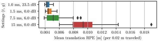 VO performance acquired with the three-axis motion table for different fixed exposure parameters. Each pair of parameters (exposure time, gain) is used over four recordings. Each recording is post-processed 10 times with ORB-SLAM. Failed runs (tracking lost) are not included.