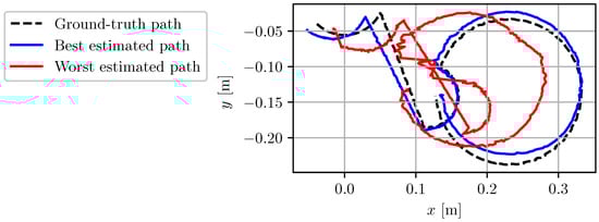 Top view of the ground-truth path followed by the left camera throughout all of the test sequences. The best and worst paths estimated by ORB-SLAM3 are overlaid for comparison.