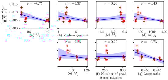 Linear regression and 95% confidence region for different candidate proxies of VO performance: (a) Gradient information metric (5). (b) Median gradient. (c) Entropy metric (2). (d) Entropy-weighted gradient metric (12). (e) Quality metric (14). (f) Number of good stereo matches. (g) Lowe ratio for the stereo matches.