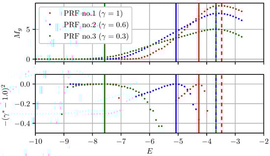 Gradient information metric for different exposure levels of the same static image. Each peak (marked with discontinuous vertical lines) corresponds to the true optimal exposure level. Peaks for the bottom graph (marked with continuous vertical lines) correspond to the optimal exposure levels predicted by Shim’s transformations []. Each colored curve represents a different camera’s PRF.