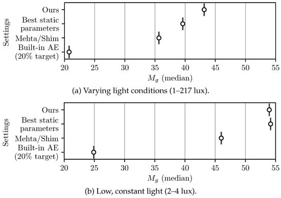 For these tests, the maximum exposure time of the camera was set to 7.5 ms, which represents about half of the cameras’ sampling time at 60 Hz. All incoming images were again preprocessed with a median blur filter and a contrast-enhancing transformation of . Each exposure method was tested in two scenarios. For both scenarios, the camera underwent the same trajectory and the objects in the scene remained the same. However, in scenario (a), lighting varied greatly between the different regions of the image (1–217 lux), while in scenario (b), lighting remained relatively low and constant (2–4 lux).