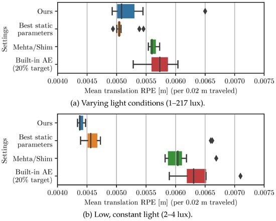As can be seen in Figure 12, the proposed AE algorithm systematically produces images with higher gradient metrics compared to the other active methods. The mean VO accuracy of each method are also compared in Figure 13 and demonstrate that the proposed algorithm achieves a lower tracking error. While the static parameters result in a similar performance to the proposed method in scenario (a), the same static parameters in (b) results in suboptimal performance. It should be mentioned that the test conditions (a) and (b) were chosen such that static parameters would generate images that a VO algorithm can track. Reusing the same parameters in drastically different light conditions (e.g., in sunlight) instead systematically results in VO failure.