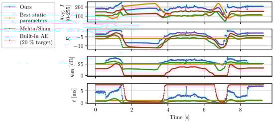 Finally, the exposure parameters selected by each exposure control method are compared in Figure 14 for scenario (a). As underlined in Section 3.2, Shim’s control method (which uses predictions based on transformations) underestimates the optimal camera exposure, leading to suboptimal VO performance.