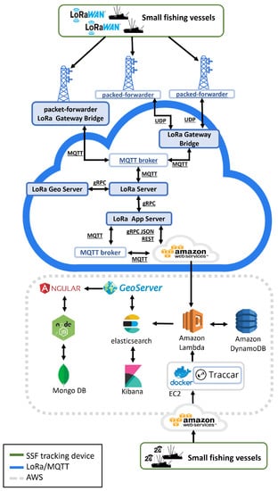 The architecture presented in [,] has been adapted to collect and ingest data sent by under-12-meter inshore fishing vessels over two different interfaces. One interface is based on a secure REST API over HTTPS, while another is based on a secure Message Queuing Telemetry Transport Secure (MQTTS) broker (Figure 1). The first interface is dedicated to manage data from 2G/3G/4G devices, while MQTTS is suitable for LoRaWAN broadcasts.