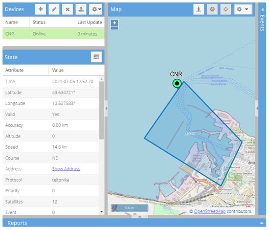 Figure 3 refers to the web interface of the Traccar Demo server—based on the Sencha ExtJS framework—that shows the real-time position of the small fishing vessel and the geofence designed to delimit the port and send triggered alerts in real-time.