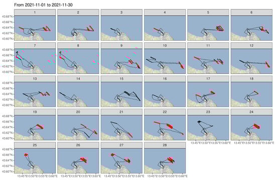 About 90.5 h of fishing operations were recorded by the tracker during November 2021, corresponding to a regular time series of 5758 records, corresponding to a total of 29 calendar days.