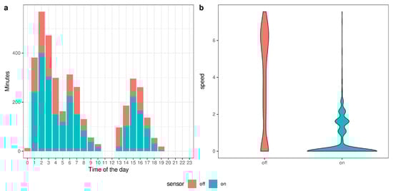 Hauling activity (i.e., sensor on; Figure 5a) indicates that gear was mostly retrieved at night and/or early in the morning (01:00–06:00) and occasionally in the evening.