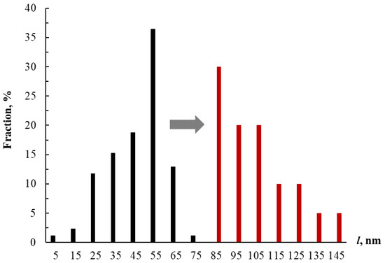 Histogram of silver triangular nanoplates distribution along the average edge length before (columns in black) and after the interaction (columns in red) with quercetin in the presence of silver(I) nitrate. c(AgTNPs) = 0.04 mmol Ag L–1, c(quercetin) = 60 μmol L–1, c(Na2S2O5) = 80 μmol L–1, c(AgNO3) = 0.20 mmol L–1, pH 6.5, t = 20 min.