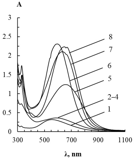 Solids were weighed using an Adventurer analytical balance (OHAUS, Parsippany, NJ, USA). Discovery Comfort automatic single-channel pipet-dispensers of variable volume (HTL, Warsaw, Poland) were used to take aliquots of liquids. Absorption spectra of nanoparticles were recorded in standard quartz cuvettes with the optical path length of 1 cm using a SF-104 spectrophotometer (Akvilon, Moscow, Russia). The pH values of working solutions were measured using an Ekspert 001 pH-meter (Ekoniks Ekspert, Moscow, Russia).