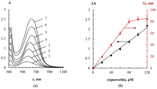 (a) Absorption spectra of silver triangular nanoplates before (1) and after (2–7) the interaction with quercetin in the presence of silver(I) nitrate at different analyte concentrations. c(quercetin), μmol L−1 = 0 (1), 20 (2), 40 (3), 60 (4), 80 (5), 100 (6), 120 (7); c(AgTNPs) = 0.04 mmol Ag L−1, c(Na2S2O5) = 80 μmol L−1, c(AgNO3) = 0.20 mmol L−1, pH 6.5, t = 20 min. (b) Dependences ΔA = f(c(quercetin), μmol L−1) and Δλ, nm = f(c(quercetin), μmol L−1). c(AgTNPs) = 0.04 mmol Ag L−1, c(Na2S2O5) = 80 μmol L−1, c(AgNO3) = 0.20 mmol L−1, pH 6.5, t = 20 min.