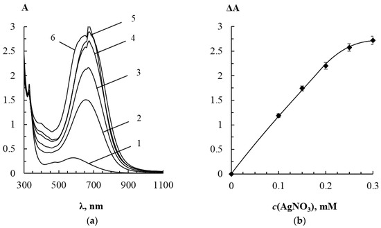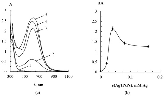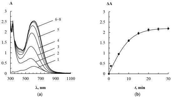 To study the effect of interaction time, the absorption spectra of AgTNPs were recorded 0, 1, 5, 10, 15, 20, 25, and 30 min after mixing of the reagents (Figure 7a). A gradual shift of the AgTNP LSPR band toward longer wavelengths and an increase in its intensity over time were recorded during the first 20 min.