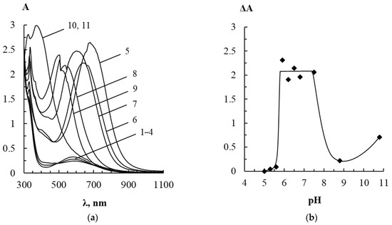 (a) Absorption spectra of silver triangular nanoplates before (1) and after (2–11) the interaction with quercetin in the presence of silver(I) nitrate at different pH. pH 6.5 (1); 5.0 (2), 5.3 (3), 5.6 (4), 5.9 (5), 6.2 (6), 6.5 (7), 6.8 (8), 7.5 (9), 8.8 (10), 10.8 (11); c(AgTNPs) = 0.04 mmol Ag L−1, c(quercetin) = 120 μmol L−1, c(Na2S2O5) = 80 μmol L−1, c(AgNO3) = 0.20 mmol L−1, t = 20 min. (b) Dependence of the analytical signal (ΔA) on pH. c(AgTNPs) = 0.04 mmol Ag L−1, c(quercetin) = 120 μmol L−1, c(Na2S2O5) = 80 μmol L−1, c(AgNO3) = 0.20 mmol L−1, t = 20 min.