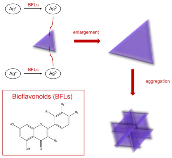 The interaction between AgTNPs and bioflavonoids in the presence of silver(I) ions does not seem to be a simple process. We assume that the interaction mechanism consists of two successive stages (Scheme 1). The first one includes reduction of silver(I) ions to metallic silver under the action of bioflavonoids and its deposition on the surface of the seed AgTNPs [33,34], which affect their size and morphology (Figure 1). The second stage includes the formation of irregular and plane-to-plane AgTNPs aggregates, whose existence was also confirmed by considering the TEM images of AgTNPs after the interaction (Figure 1c). Most likely, aggregates are formed due to a decrease in the thickness of the electric double layer, which leads to a decrease in the electrokinetic potential of nanoparticles and a loss of aggregative stability of the system.