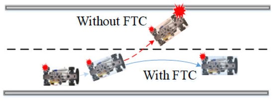 The types of actuator faults in driving wheels are complex and may include additive faults, stuck-at-fixed-level faults, loss-of-effectiveness, and so on. In addition to the large number of possible faults, certain faults never seen before may occur during operation [2], causing vehicles to operate in an unstable state or even leading to catastrophic events. For example, assume a skid steering vehicle is operating on the road, as depicted in Figure 1, when an unexpected fault on the rear left wheel compromises the stability of the vehicle. Without FTC, the vehicle would operate under an instability condition and collide with nearby facilities; conversely, with FTC, the vehicle’s collision risk may be avoided [3].