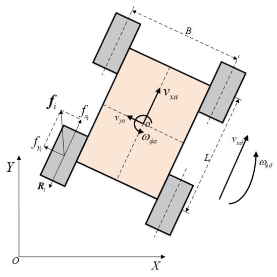 In this work, we establish a dynamic model for the skid steering vehicle with four independent driving wheels [40]. Figure 3 shows that the friction between the wheels and ground result in the vehicle’s motion. Thus, with Newton’s Second Law, the dynamic model of the vehicle system can be described as: