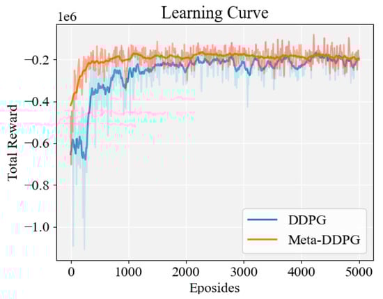 According to the definitions of the state space and the definition of the action space, the meta-DDPG model has a 4-dimensional input and a 4-dimensional output. In meta-DDPG, the policy neural networks are constructed as and the Q-value neural networks are constructed as . The specific parameters of the meta-DDPG algorithm are listed in Table 4.