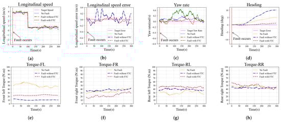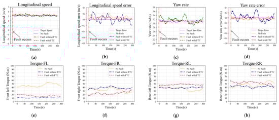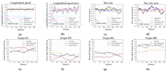 The same trend is observed in the case with fault in the constant steering scenario, as shown in Figure 10. The longitudinal speed and yaw rate fluctuations in the case without FTC are more severe than in the other two cases, and the tracking error performance is worse as well. Compared with the no-fault case, the longitudinal speed and yaw rate tracking performance of the case with FTC is similar or even better. Driving wheel torques with fault in the constant steering scenario are shown in Figure 10e–h. The torque on the rear right wheel with fault is significantly increased due to additive fault, and the front right torque is reduced to balance the yaw of the vehicle.