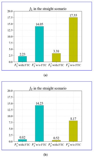 To quantitatively illustrate the improvement of the proposed FTC control strategy more specifically, Equation (18) is used to evaluate the performance of the longitudinal speed tracking and yaw rate tracking. The results of and in the straight scenario are displayed in Figure 8.