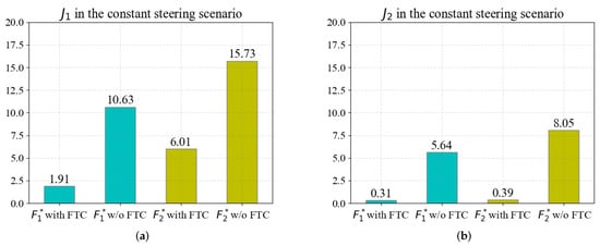 The quantitative evaluation results in the constant steering scenario are shown in Figure 11, which are similar to those in the straight scenario. The results of are shown in Figure 11a; the FTC method reduces of the fault by and the fault by . As shown in Figure 11b, the FTC method reduces of the fault by and the fault by . The evaluation results demonstrate that the proposed FTC can effectively reduce the impact of actuator faults in the constant steering scenario, indicating that the proposed FTC method can effectively improve the tracking performance of the vehicle with faults in the constant steering scenario.