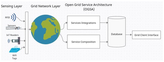 This paper proposed an enhanced greedy firefly algorithm for job scheduling on the IoT grid. The proposed greedy algorithm is based on a discrete firefly algorithm. The study applied the smallest position value (SMV) mechanism []. The idea behind the proposed greedy firefly algorithm is to combine the benefits of the firefly algorithm and greedy algorithms by using the greedy choice to help enhance the firefly algorithm schedule. Furthermore, the greedy choice allows the firefly solution to search for schedules’ near-optimal solutions. The IoT grid environment is presented in Figure 1. The IoT grid environments consist of four layers: a sensing layer, a grid network layer, an open grid service architecture layer, and the client interface layer. The sensing layer contains the sensors’ RFID readers and other IoT devices. The grid network layer represents the grid computing network core. The third layer is an open grid service architecture in which service integration is provided between grid resources and IoT devices. The last layer is the IoT grid user interface. The process starts when grid clients build an IoT application that needs computational grid power. Next, the client application is submitted to grid resources, and clients can require additional resource specifications. When the execution process starts, the information requested by the sensors is collected using the embedded system’s devices. The next step includes submitting the execution request to the grid IoT scheduler. The grid IoT scheduler schedules all the submitted jobs based on the proposed scheduling mechanism. Finally, the execution results are sent back to the IoT system.