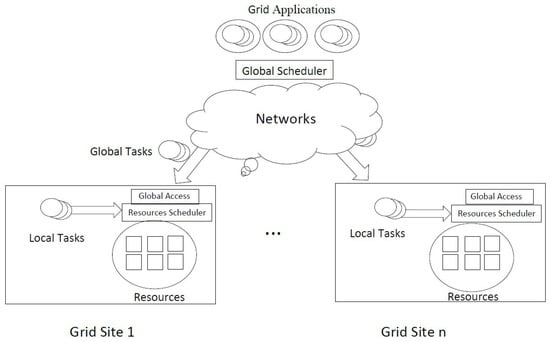 The computational grid is a distributed technology consisting of multiple distributed heterogeneous resources in different network sites [,,]. The Internet of Things (IoT) is defined as interconnected digital and mechanical devices with intelligent and interactive data transmission features over a defined network [,]. Grid computing is a large-scale computational environment consisting of a huge number of heterogeneous resources combined to perform complex processes []. From a communication viewpoint, the IoT is identified as a system of interconnected things, each with a unique address to deliver computational services and connect using specified protocols. The IoT comprises things such as sensors, computing devices, embedded systems, objects, and animals with unique identifiers and that have the capacity to transmit data over a specified network [,,,,]. The IoT grid was introduced to integrate the grid services with IoT architecture [,]. The IoT grid benefits from deploying grid service architecture for IoT technology [,]. The grid sites are clusters, super computers, or multiprocessor computing networks []. Moreover, global resources and tasks send application jobs through the global grid job scheduler. Given several clients’ jobs and several heterogeneous resources, the grid job scheduling problem is finding a schedule that maps the client’s jobs to site resources to optimize specified scheduling criteria [,]. The complexity of the computational grid increased due to the high heterogeneity of grid resources, the complexity of computational problems, and the dynamic nature of resources []. These complexities of computational grid environments offer an opportunity and challenge for developing grid job scheduling mechanisms based on metaheuristics and nature-inspired methods to optimize the grid job scheduling process. The job scheduling process aims to find the optimal mapping of clients’ jobs to grid resources that minimize the execution and makespan times []. The exponential increase in the size of the solution search space inspired more research to utilize optimization methods to tackle grid job scheduling gaps [].