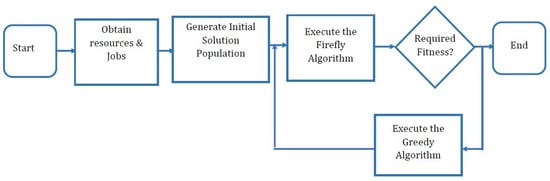 This study considers the execution and makespan times to be minimized. First, the study defined as the time that the last job, completed execution. Consider as representing makespan time and represents the execution time. The proposed scheduling method improves the standard firefly algorithm presented in []. In the proposed method, the study combines the standard firefly algorithm with the greedy algorithm to enhance the scheduling and minimize the makespan time. In the greedy firefly algorithm, the greedy method is employed as a local search mechanism to improve the rate of convergence and quality of the solution generated by the standard firefly algorithm, as shown in Figure 4.