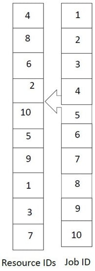 Figure 5 describes an example of a valid firefly algorithm schedule. As shown in Figure 5, job number 1 is scheduled to the resource with ID 4, and job number 2 is scheduled to resource with ID 8, and so on.