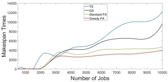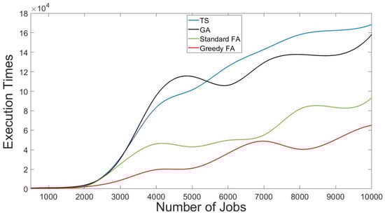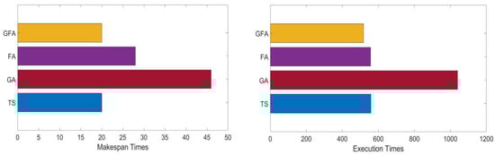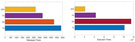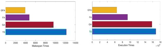 The study evaluated the GFA under a heavy workload environment containing 10,000 jobs. The makespan times and execution times of the TS, GA, and standard firefly algorithm and the GFA are reported in Table 7 and depicted in Figure 10.