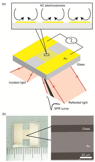 Surface plasmon resonance (SPR) sensing offers advantages in terms of label-free and real-time techniques with high sensitivity [1,2,3,4]. SPR sensors are powerful tools in the fields of biochemistry, clinical diagnosis, food analysis, and environmental biology [5,6]. Among the several types of SPR sensing techniques, the Kretschmann-type configuration is the most widely used because of its simple optical setup and sensor chip geometry [7,8], and the systems are commercially available (e.g., Biacore). Improvement of its detection limit and integration of various functions on a chip has been reported [9,10,11] and is expected to broaden its potential applications. To expand the detection limit for small and low-concentration proteins, we have developed a Kretschmann-type sensor chip that enhances the binding of analyte protein molecules onto the sensor surface using an electrokinetic phenomenon, alternating current electroosmosis (ACEO).