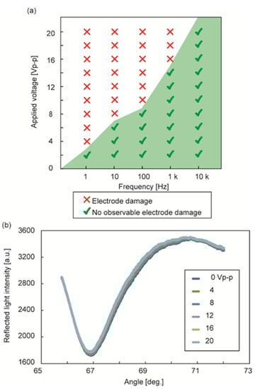 Effects of sinusoidal voltage application to microelectrodes: (a) Electrode damage caused by voltage application of various amplitudes and frequencies in 10 mM PBS solution; (b) SPR curves in voltage application (0–20 Vp-p and 10 kHz).